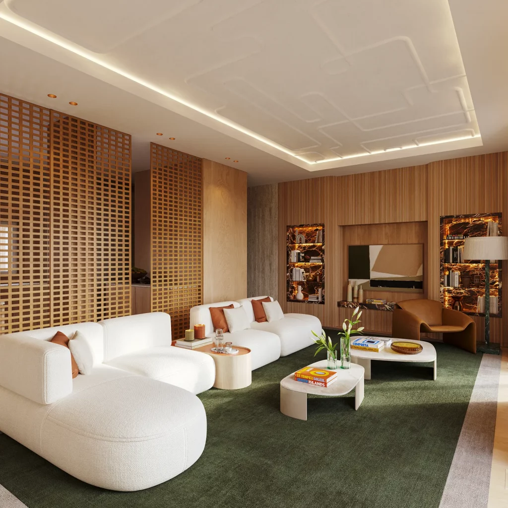 The living room features a calm palette of creamy whites, earthy browns, and a rich deep green rug. Textures like boucle upholstery, ribbed wood paneling, and lattice screens add depth, while soft curves in furniture enhance comfort. Curated books and objects create intimacy, making it an inviting space for slow living that feels tactile and harmonious.