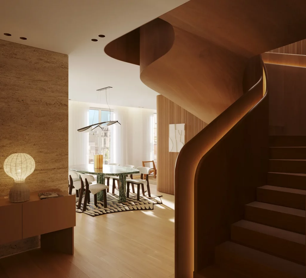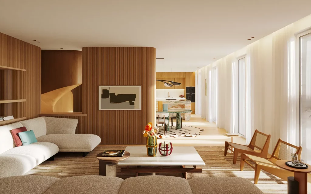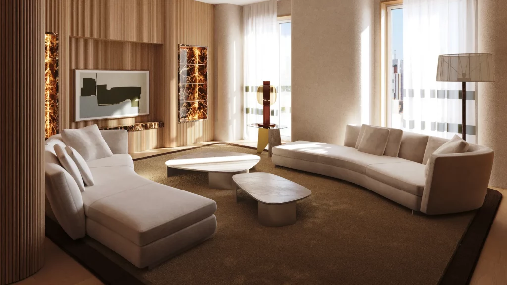 This living room embodies Urquiola’s warmth with organic curves, tactile fabrics, and wood paneling, creating a calming atmosphere. Natural light enhances the earthy palette and layered textures, while sculptural furniture and artful accessories add character. The design prioritizes beauty alongside a welcoming, comforting ambiance.
