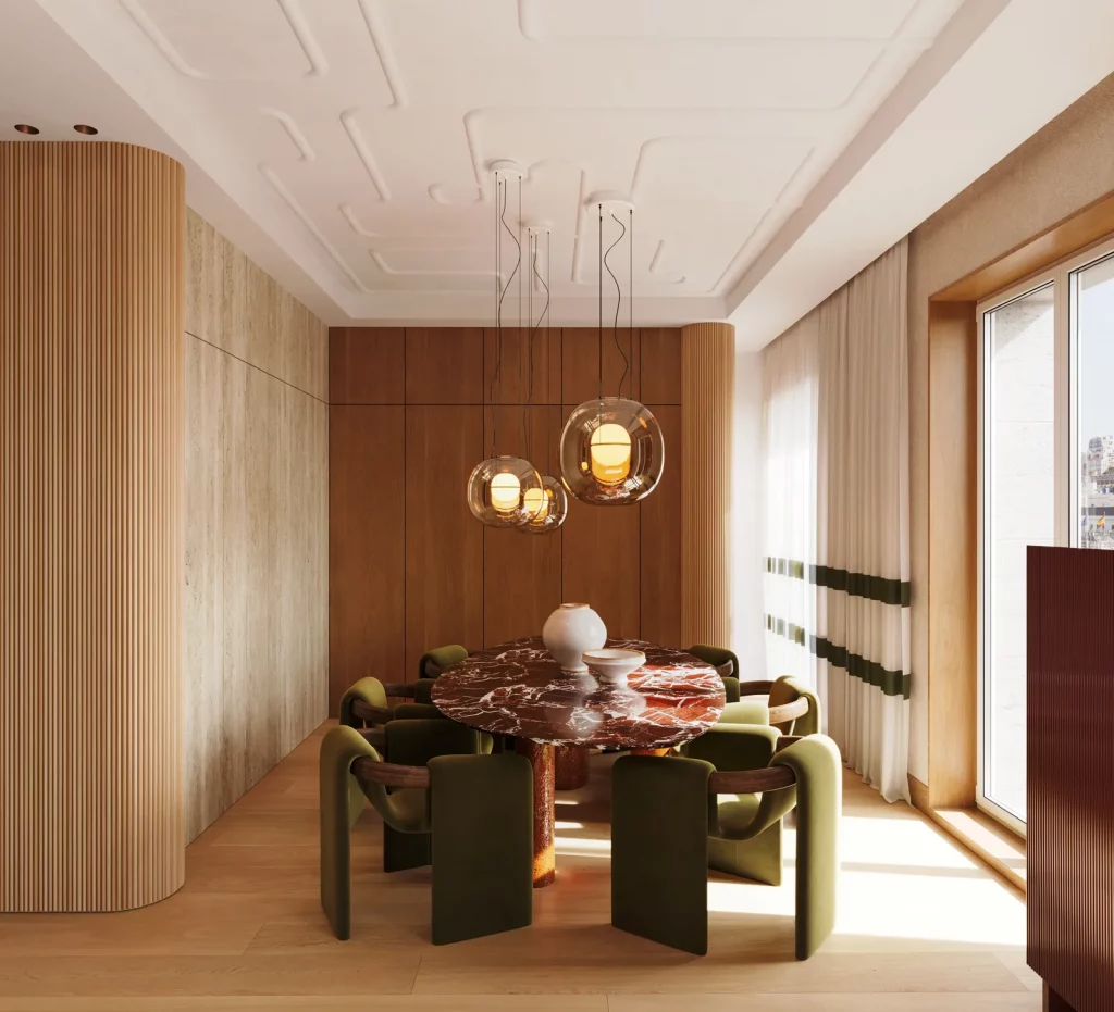 The round marble table serves as the room’s focal point, surrounded by soft green chairs that contrast with the strong material. Gentle wood paneling and natural light create an intimate yet elevated atmosphere, ideal for slow meals and meaningful conversations.