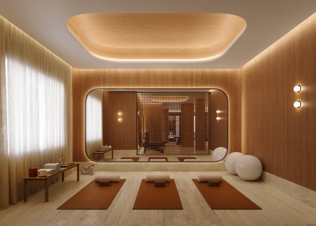 The wellness room is a serene sanctuary for relaxation, featuring warm wood, gentle lighting, and soft forms. A large mirrored wall enhances the sense of space and calm, promoting slow breathing, mindful movement, and a relaxed state.