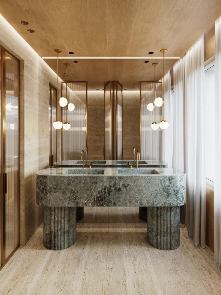 This powder room features sculptural elegance with a statement stone vanity, brass accents, and soft lighting that add warmth. The refined materials and clean lines create a calm, elevated, and luxurious atmosphere.