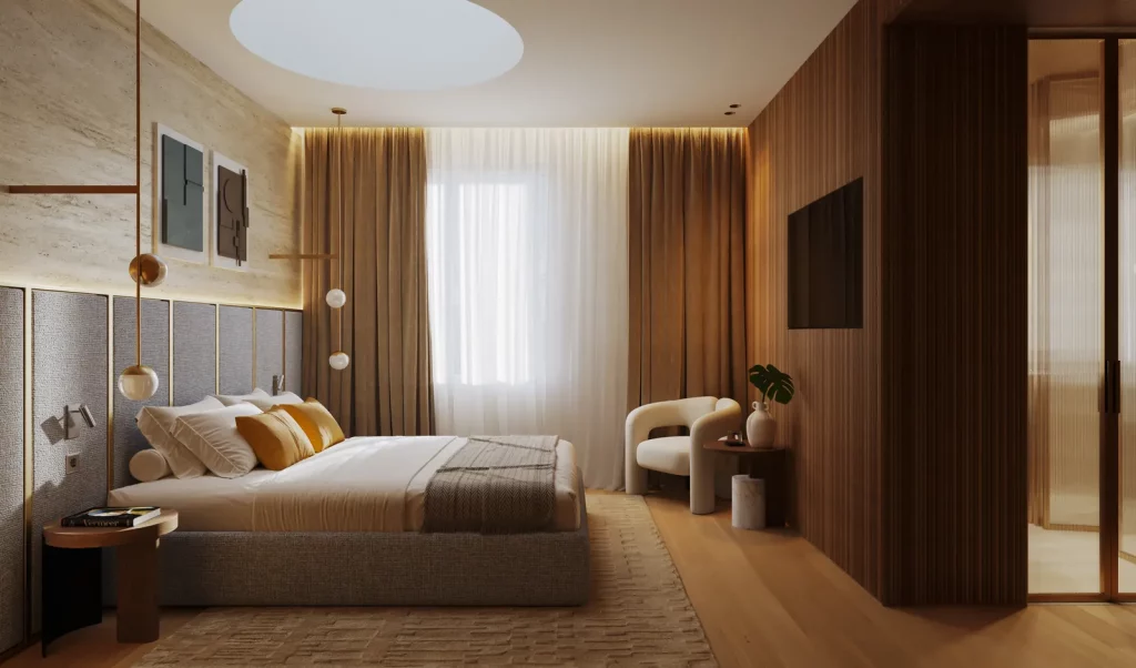 The bedroom embraces quiet luxury through layered textures and a warm, natural palette. Soft upholstered surfaces and gentle lighting create a cocoon-like atmosphere that encourages rest. Curved furniture pieces add subtle softness, while the thoughtful play of neutrals and earthy tones enhances calmness. It’s a sanctuary where comfort, form, and elegance live in effortless harmony.