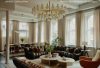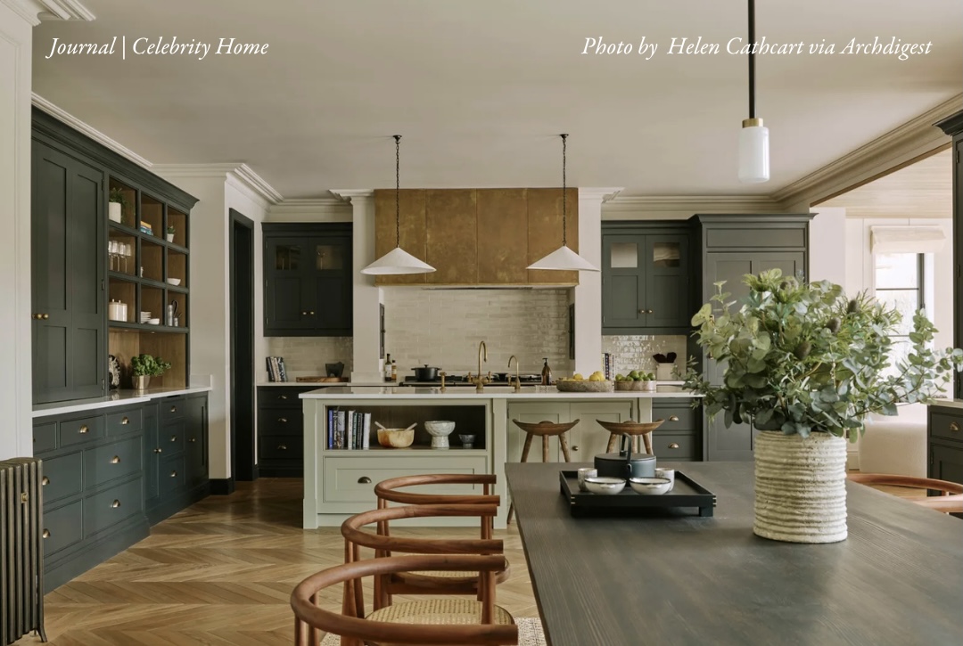 The kitchen, adorned with various shades of green and stylish cabinetry, serves as one of the most communal areas in his home. Chilwell chose to place the dining table in this space rather than in a separate room to promote a more relaxed dining atmosphere.