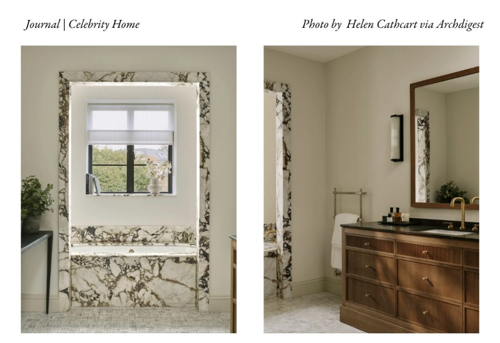 Strong character meets serene design. The bold marble, with its deep veining, brings drama and permanence, while the warm wood tones and brass accents soften the mood. Every detail reflects Ben’s appreciation for spaces that feel both grounding and indulgent.