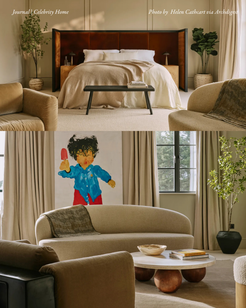 The primary bedroom serves as a calming sanctuary, blending softness with structure. An oversized headboard provides a cocooning effect, while neutral fabrics and lighting add a sense of quiet luxury. Natural textures and a soft palette reflect Ben’s vision for a warm and personal retreat. The painting in the primary bedroom is by Olaolu Slawn, and the curved sofa and chair provide a gentle touch for his personal sanctuary.