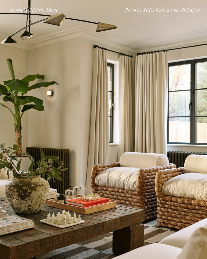 Affectionately known as the “Christmas room,” this inviting space fosters togetherness and celebration for his family. The woven armchairs and vintage coffee table bring warmth and texture, grounding the space in natural comfort. With its soft palette and relaxed California vibe, it’s a room made for togetherness, where every Christmas morning feels timeless.