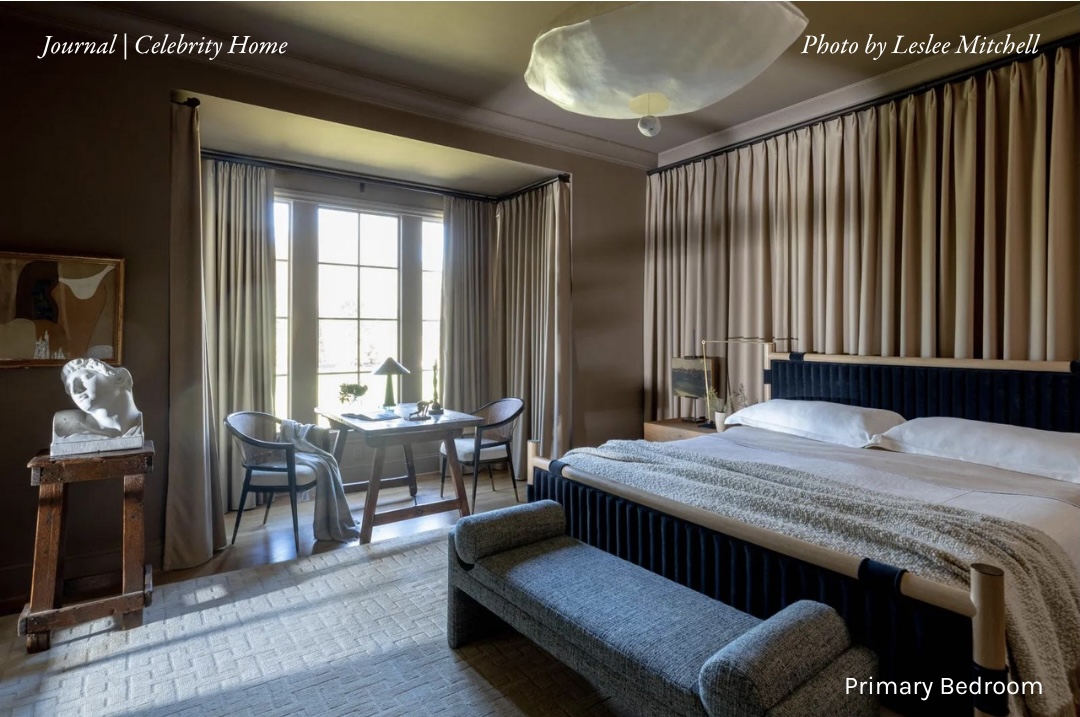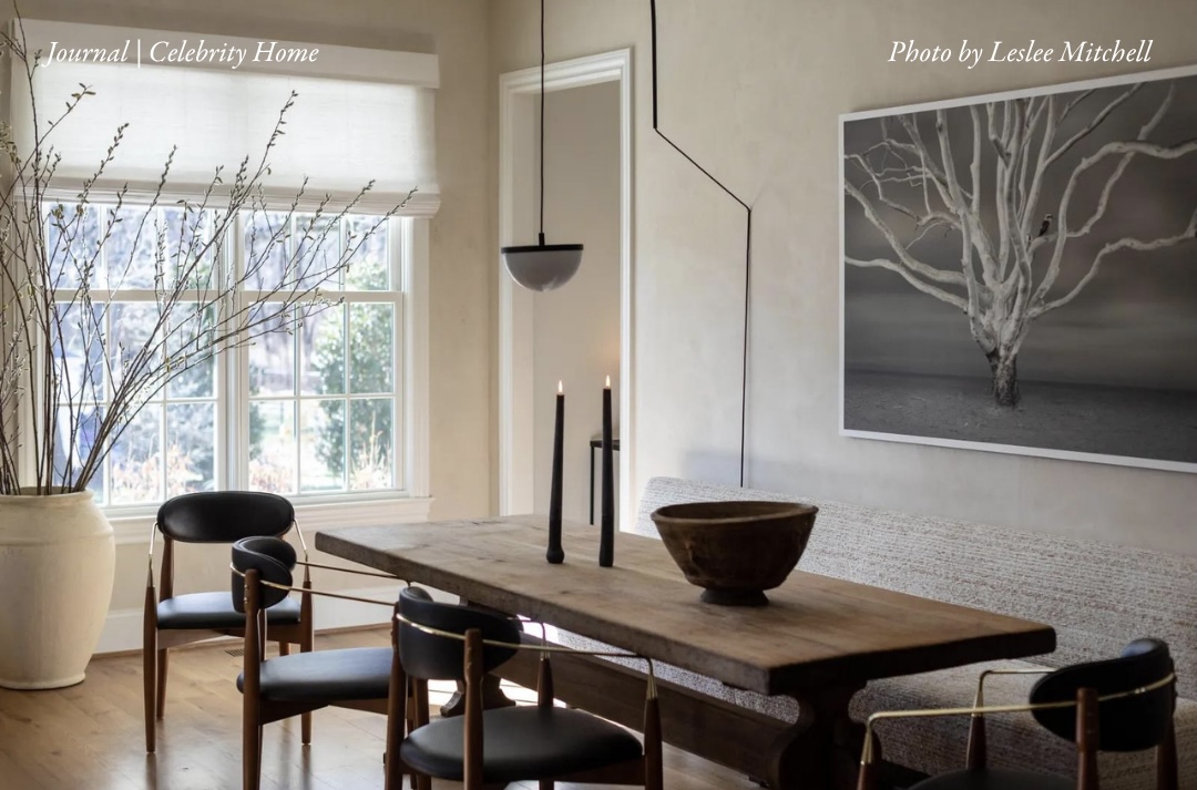 Rains, the designer, has enhanced the dining area to make it more spacious. They have transformed the large table into a versatile surface for work-from-home tasks, including autographing posters for the rock star.
