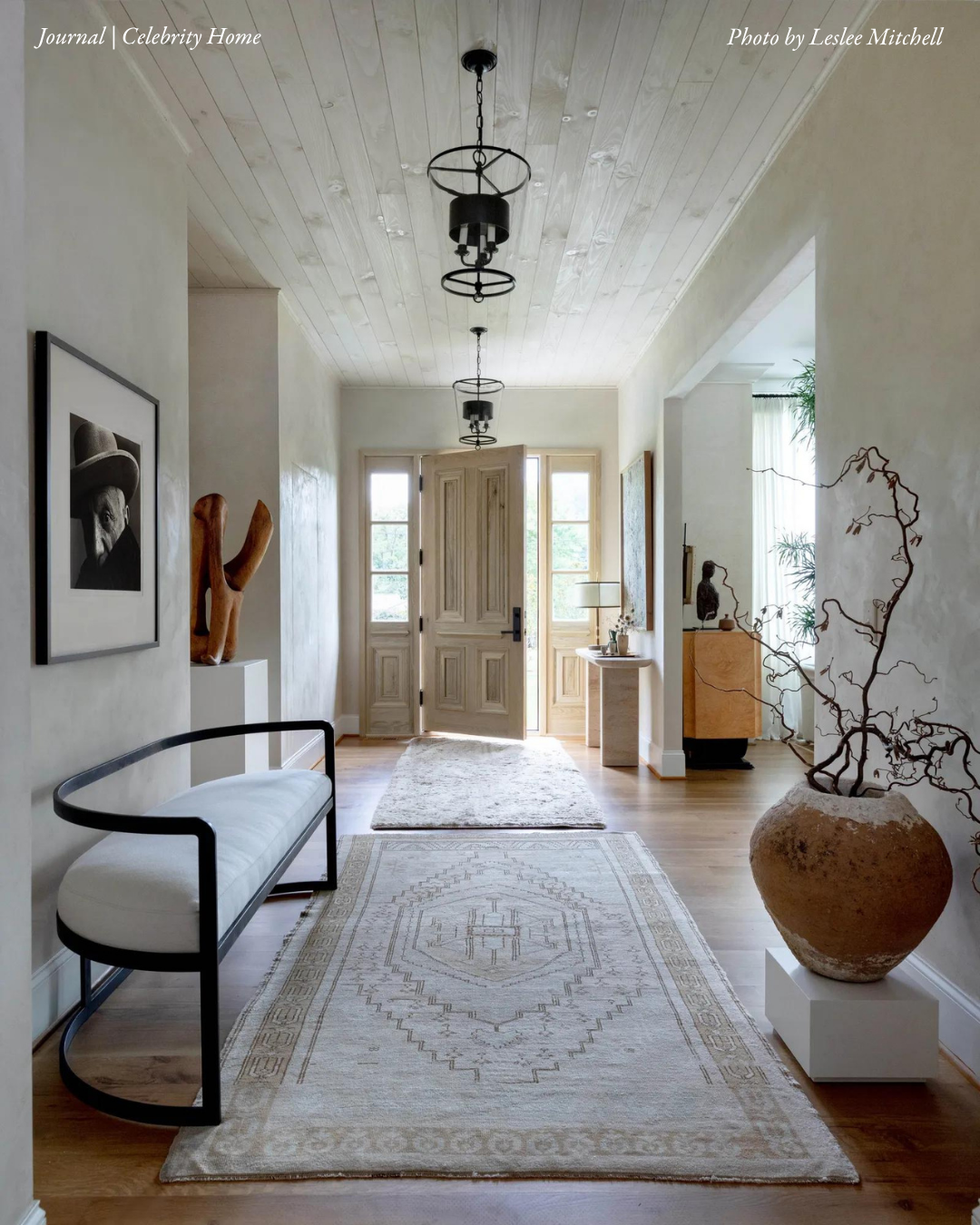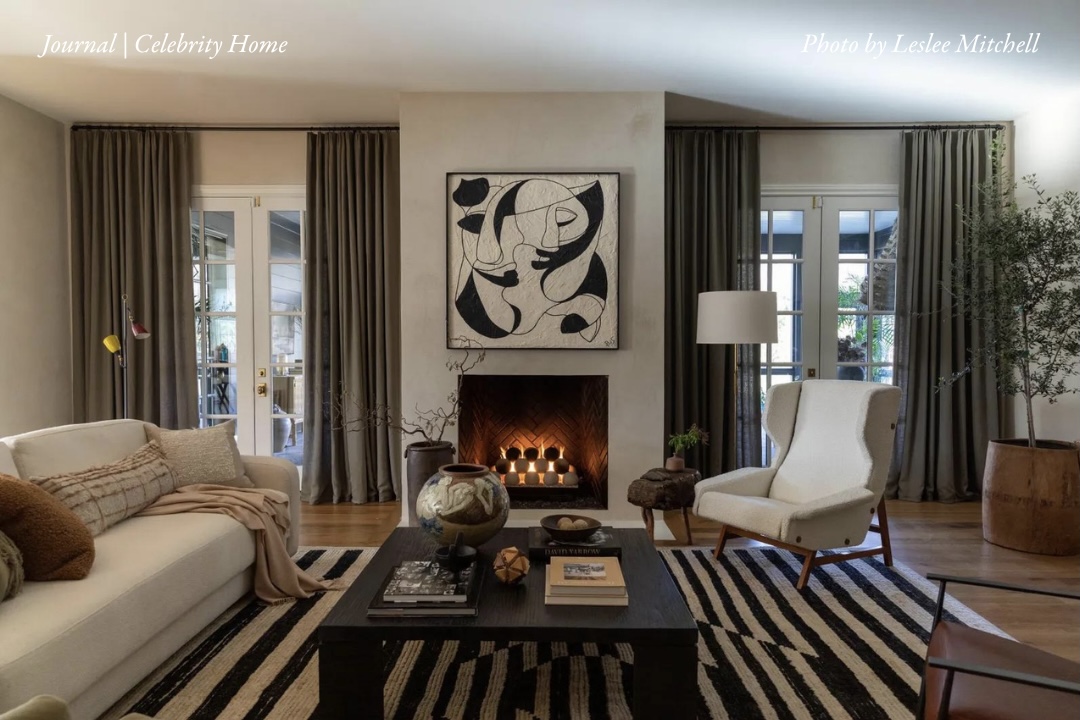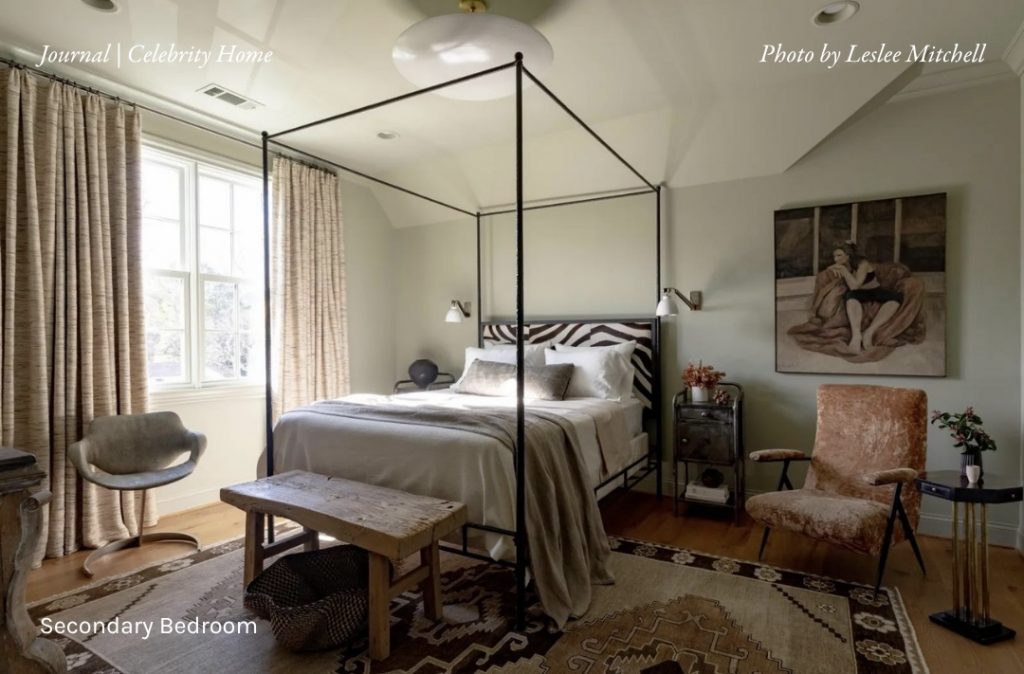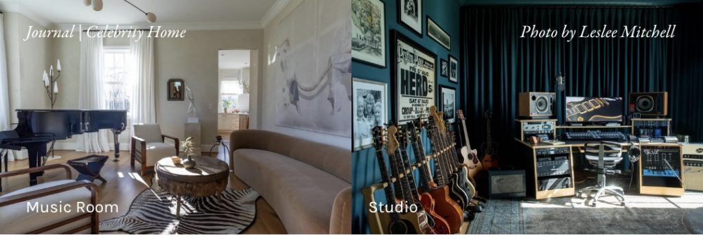 In the music room, there is a triptych featuring Japanese martial artists above a sofa, while the chandelier is adorned with ostrich egg-shaded lamps. In the studio, Rains has decorated it with a tastefully aged vintage rug and curtains to enhance the visual and acoustic ambiance during jam sessions.