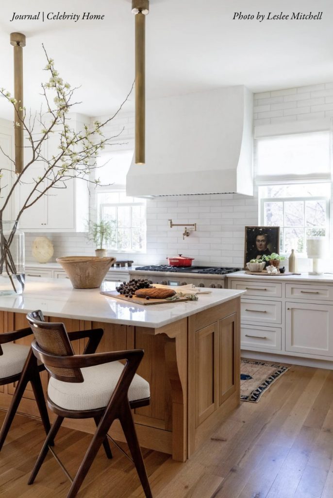 A wooden kitchen island and flooring contribute to a cozy ambiance. Brass pendant lights emit a warm golden light, complemented by white-painted brick walls that provide a bright and textured setting. This kitchen seamlessly combines style and functionality for cooking, hosting, and daily activities.