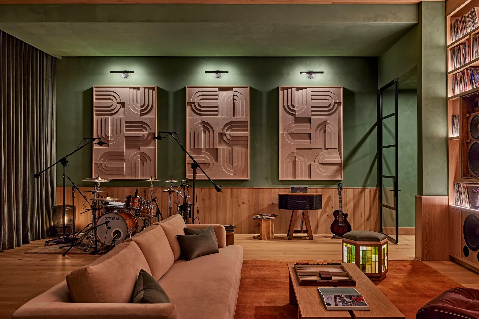 The studio features Sharon Kingston paintings, stained glass windows, and Ripple Fold curtains. There is also a striking stained glass stool, a high-pile mohair sofa, a Kyoto coffee table, a hand-knotted wool rug, and a Yamaha custom drum set.