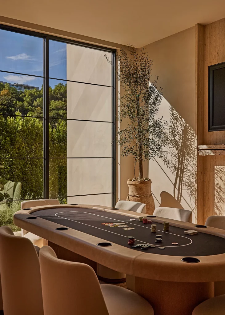 Zaslavski placed all the furniture in the living room and transformed the family room into a poker room for friendly poker games. The table was custom-built, complete with an antique case.