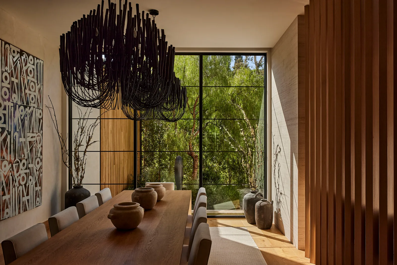 Designer Omar loved the interplay of light in the dining room, which is dimmed by a 45-degree white oak entry screen and accompanied by the sound of a waterfall outside the floor-to-ceiling glass. He found it to be intimate and homely, and incredibly soothing.