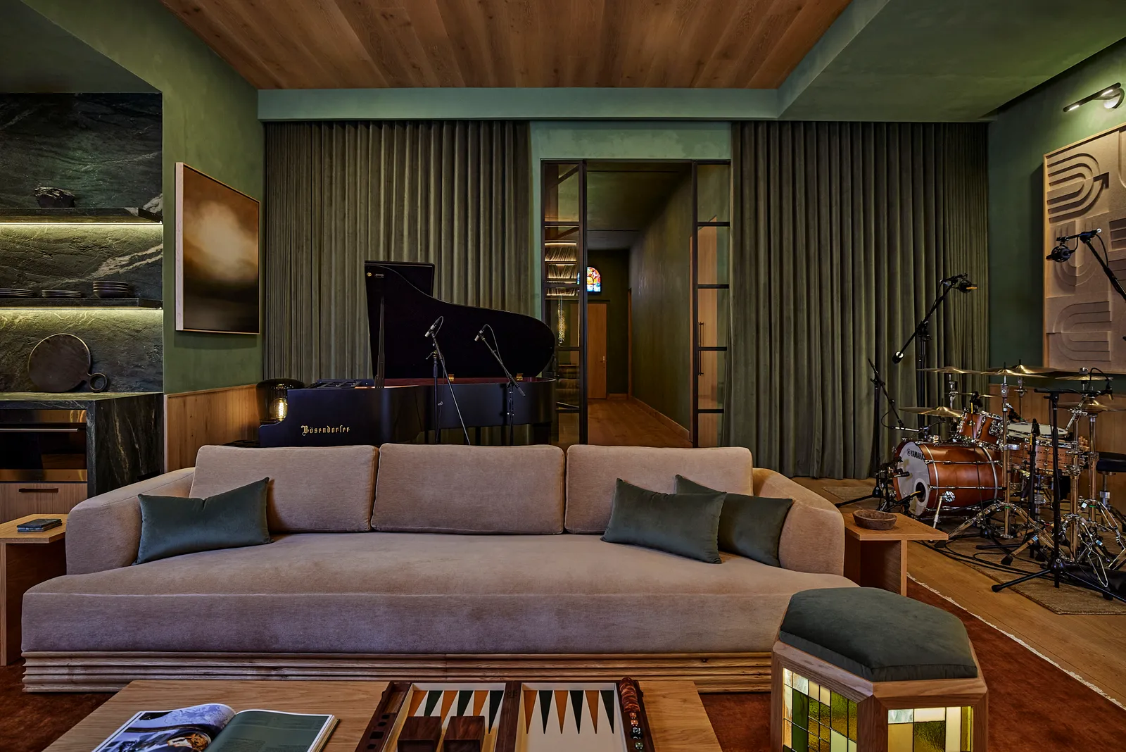 The musician’s bedroom features a custom-made interior, featuring a Mark Acetelli oil painting. His favorite piece of furniture, a Bösendorfer piano, is his dream. The sofa curves smoothly and sits on an alpaca rug, with a cocktail table in front of the fireplace.