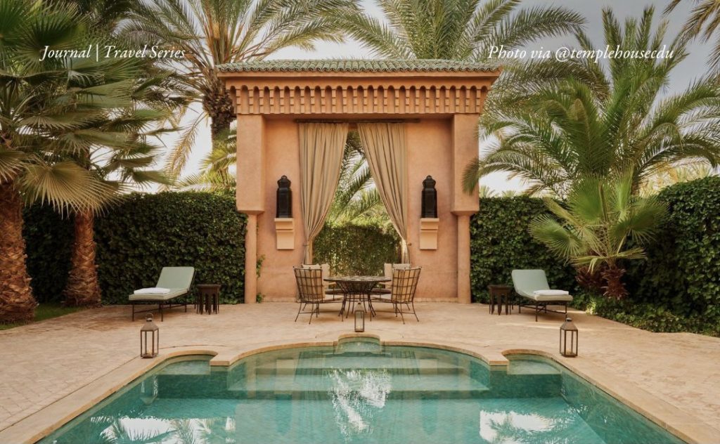 Amanjena is nestled serenely on the desert’s edge, enveloped by lush gardens, tranquil fountains, and sun-kissed courtyards. Its pavilions and maisons, adorned with elegant arches and vaulted ceilings, exude a subtle charm of Moorish sophistication. In the distance, the majestic Atlas Mountains loom, creating a scene that is both serene and unforgettable.