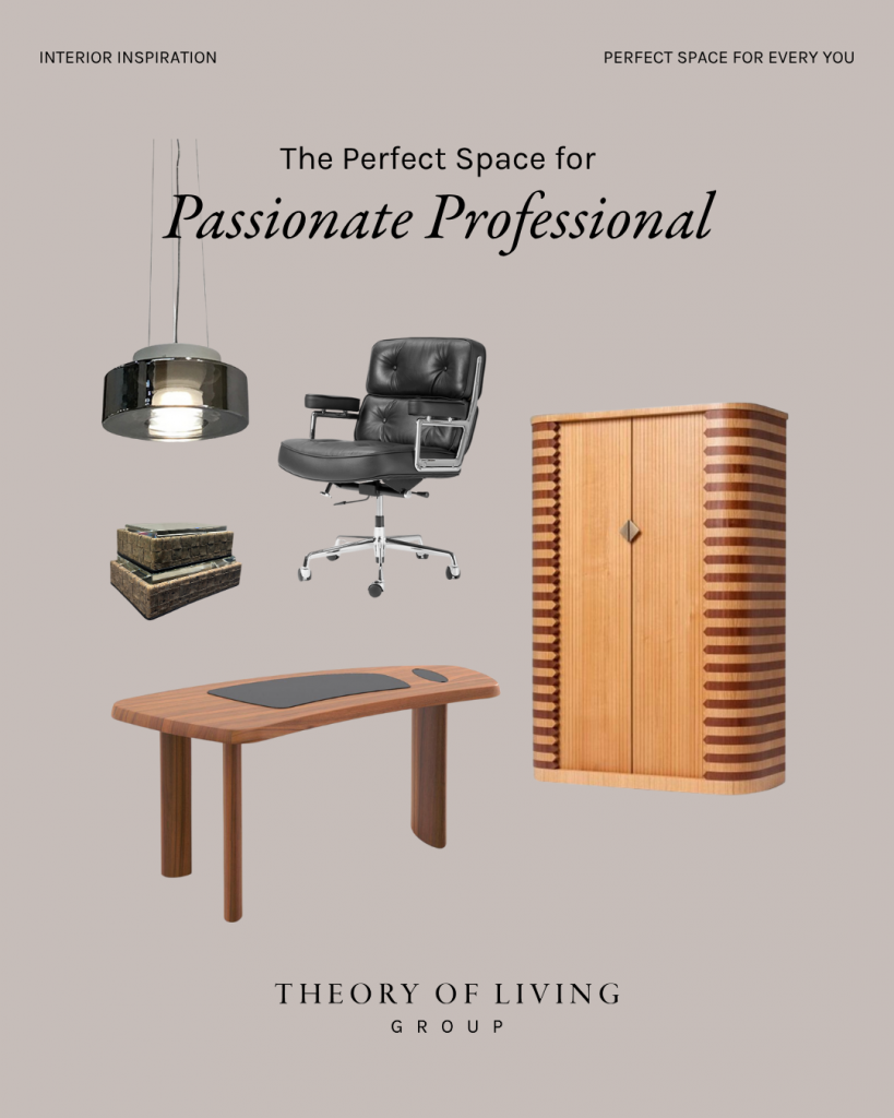 A semi-curved working table with a wheeled swivel chair enhances mobility during focused work sessions.